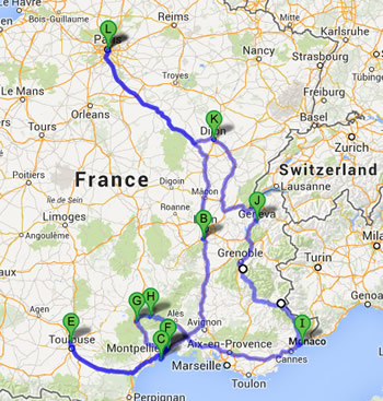 This is a much needed (and wanted) holiday. A chill-out. We’re visiting a fair bit of France, with just a wee trip to London. Here’s the map (usual disclaimers apply, subject to change, YMMV).