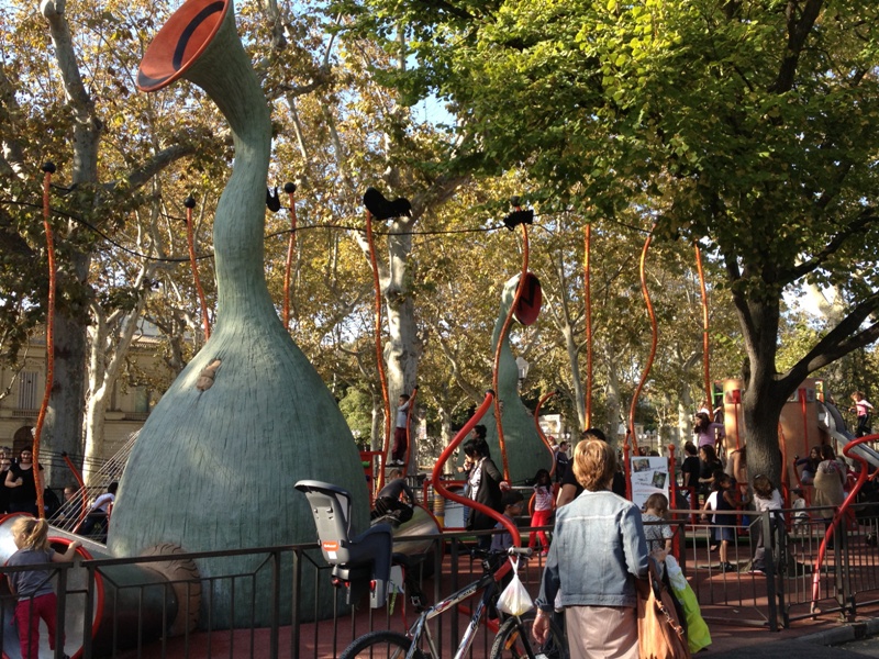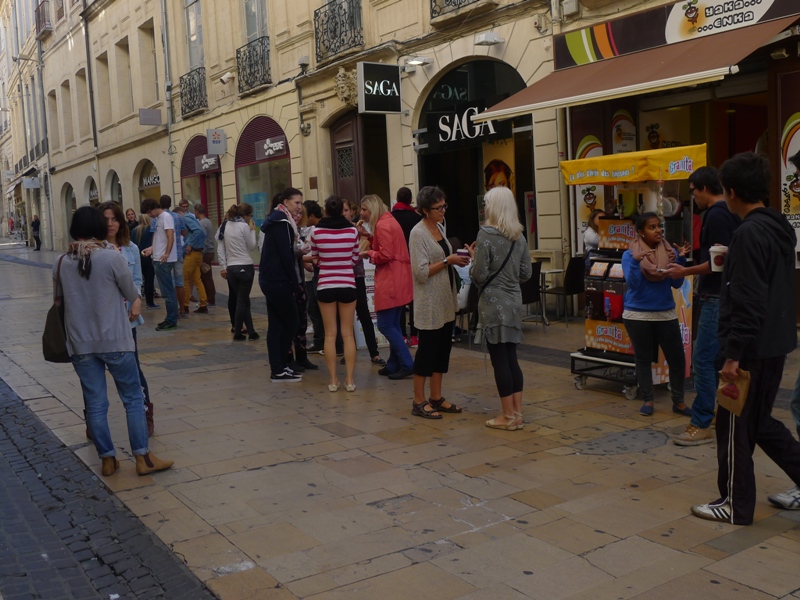 On the first day however, having had so much fun with the GPS we thought we’d drive to school. Not our smartest decision. Epic fail, in fact. We drove for well over an hour, with our little GPS man telling us to go left into dead-end lanes, or turn right after we’d done so, and at one stage we ended up driving around the pedestrian-only Place de la Comédie, in circles mixing it with the trams. A gendarme drove past and looked us over, but his face seemed to be saying “crazy foreigners, you can’t help them”. Finally, in desperation, we parked at the railway station and walked to the school. Only later did we realize that we could have walked from apartment to school in about fifteen minutes!